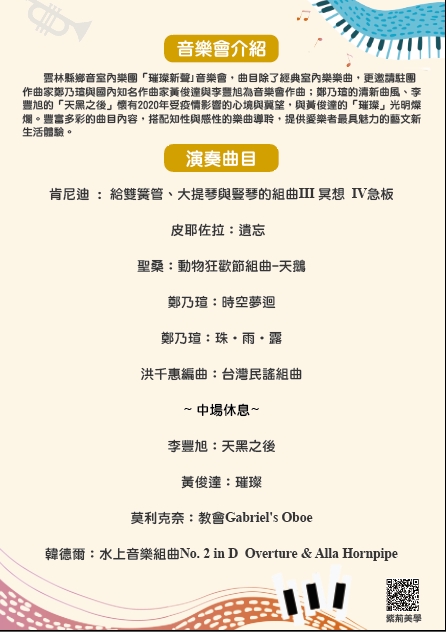 我很高興知道雲林縣鄉音室內樂團10月15和16日的兩場在北港跟斗六的音樂會,我的作品為室內樂團《天黑之後》首演成功的消息。然後在我生日的前夕,我得知這首曲子又有機會在10月27日在嘉義中正大學33週年校慶音樂會再次被演出一次,時間是晚上7點在中正大學活動中心演藝廳。覺得自己跟這首曲子像是收到一個意外的生日禮物,真的很幸運。如果你有時間,又會有個機會來參加音樂會支持雲林縣鄉音室內樂團。