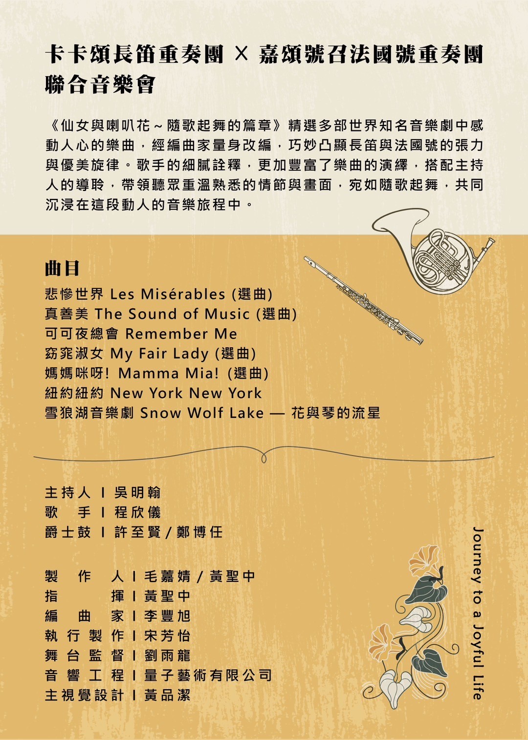 This concert, titled “Flutes and Horns – Journey to a Joyful Life,” is specially designed for flute and horn players from Chiasong Ensemble, featuring guest singers and percussionists. It will take place at the Chiayi City Concert Hall (Chiayi, Taiwan) at 2:30 PM on December 1, 2024.
