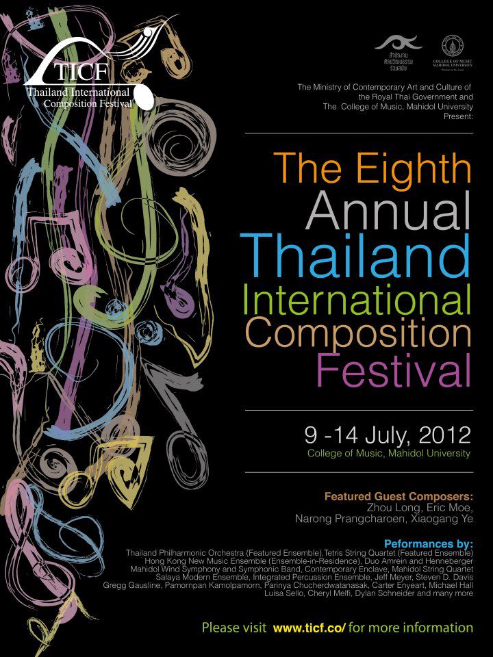I received an email from Dr. James Ogburn, project manager of Thailand International Composition Festival 2012 (TICF) and also Chair of composition and theory at the Mahidol University College of Music, last Friday. He did lots of effort putting videos of every premiere piece in TICF on YouTube, including my piece. Thank James! By watching these videos it made me recall those days staying in Bangkok and in TICF. It was a wonderful experience to me. Although some problems occurred in rehearsing my piece, I still figured out the Thai musicians did their good job learning such a difficult piece in a very short time.